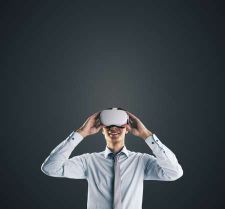 Virtual reality concept with young businessman gets new emotions in VR glasses on abstract black background and empty space on his head for you text, mock up
