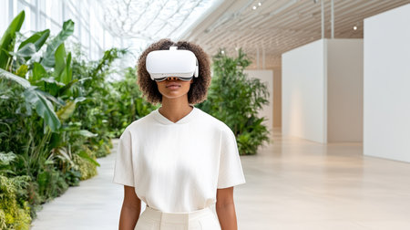 A woman wearing virtual reality goggles in modern art gallery surrounded by greenery