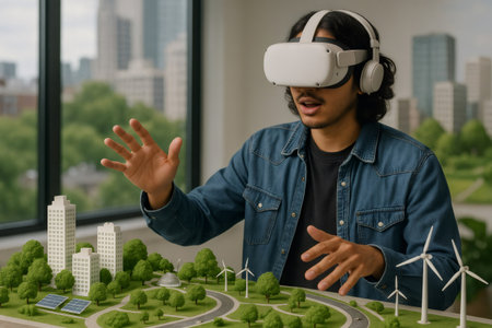Architect wearing virtual reality headset interacting with a model of a sustainable city, exploring innovative urban planning solutions