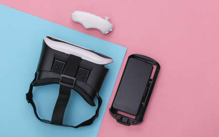 Virtual reality headset with joystick and smartphone on pink blue pastel background. Modern gadgets. top view