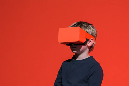 Boy wearing orange VR headset against a bright red background, showcasing excitement and curiosity about virtual reality technology