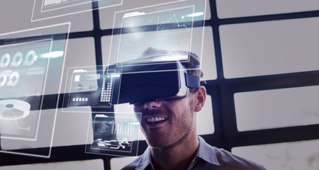 Business interfaces against businessman using virtual reality device