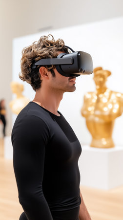 Man wearing virtual reality headset explores contemporary art installation with golden sculptures. Bright gallery setting with polished wood floor.
