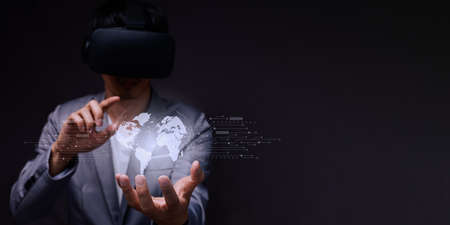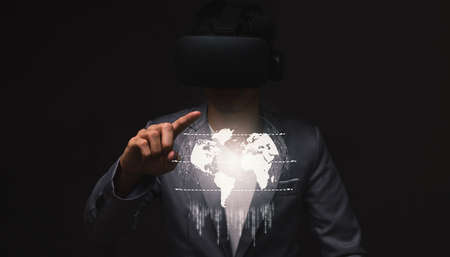 Man wearing a reality virtual headset touching a digital world concept on a touch screen with his finger