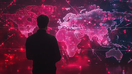 Silhouette of a man in front of a digital world map