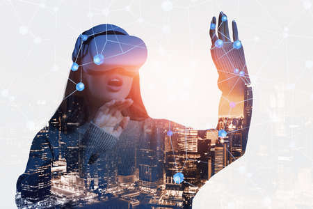 Attractive woman wearing virtual reality goggles. VR headset. Unusual double exposure virtual reality concept.