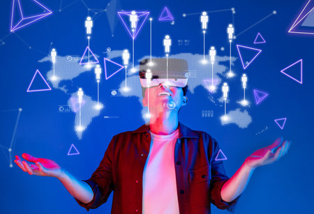 A person wearing a virtual reality headset stands against a blue background, engaging in global networking and communication within a digital environment.