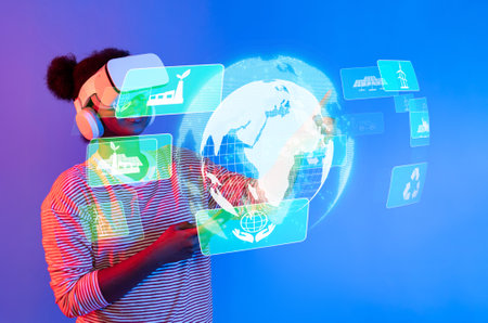 A young individual engages with virtual reality, exploring sustainable technologies and eco-friendly concepts, highlighting innovation for a cleaner, greener future.