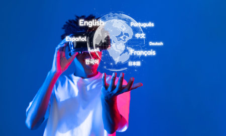 Explore the future of language translation technology showcasing generative artificial intelligence in a virtual environment, enhancing global communication and understanding.