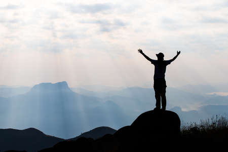Silhouette of man hold up hands on the peak of mountain,success concept
