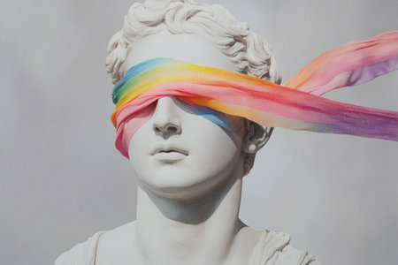 A serene marble statue of a young man blindfolded with vibrant silk ribbons, symbolizing insight beyond sight, embracing themes of identity and perception