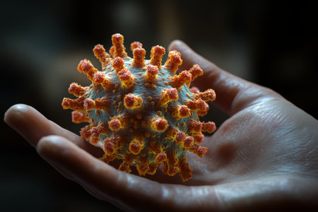 An artistic illustration depicting a virus held in a human hand, representing the serious effects of various pathogens