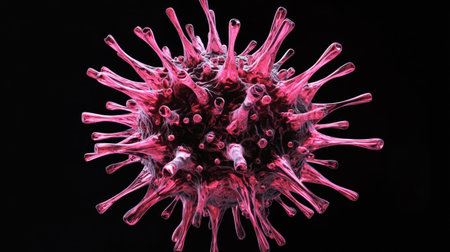 A vivid depiction of a microscopic virus with pink spikes highlights its structural complexity and significance in health science.