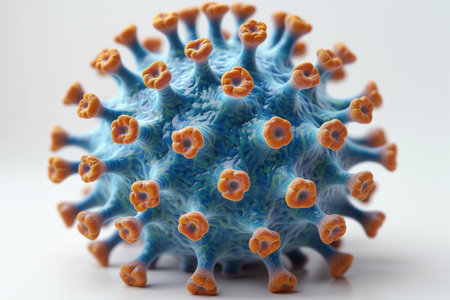 detailed and textured representation of a virus molecule with prominent spike proteins, set against a white background.