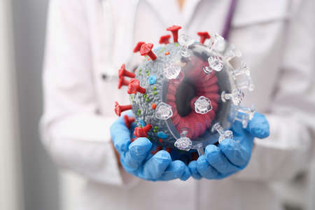 Scientist virologist holding model of new or