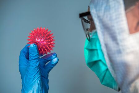 Male scientific with protective suit holding a Coronavirus red model. Caucasian man with molecule of COVID-19. The concept of infecting or transmitting a virus between people.