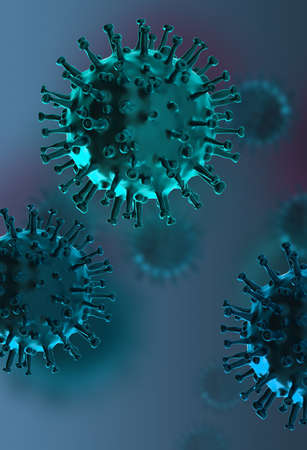 close-up coronavirus type covid-19, h1n1, bird flu or swine flu background. 3d rendering of representation of virus as microbiological microscopic background. Blue green gradient colors