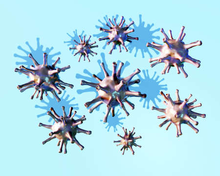 Floating beautiful shiny viruses on blue background, 3d illustration
