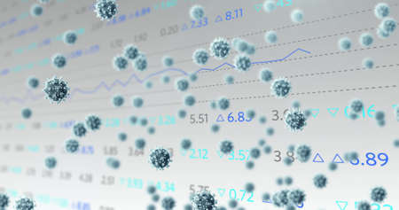 Image of virus icons over financial data processing on white backgoround. global business, finances, connections and digital interface during pandemic concept digitally generated image.