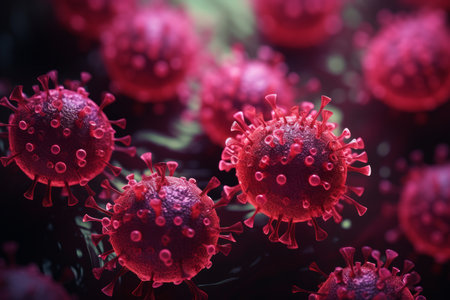 Coronavirus illustration, microscopic view of viruses, yellow and blue details against a red background, depicting the structure of the virus in a scientific and educational context