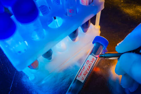 Diagnosis of coronavirus. Negative test result for Covid-19. Medical research with the aim of identifying cases of coronavirus. Analysis for coronavirus. The technician makes a note on the test tube.