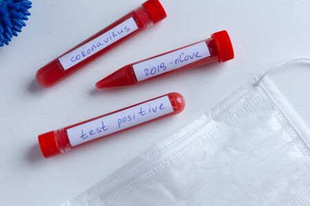 Corona virus and Covid-19 positive blood test tubes on the white background, studio shoot. Blood test samples. Diagnosis and laboratory.