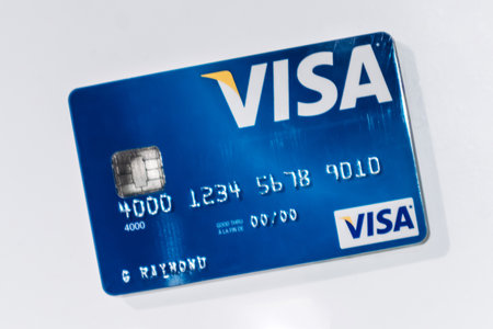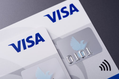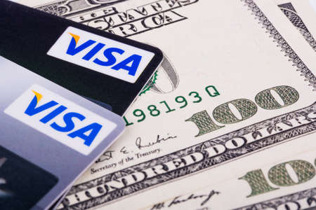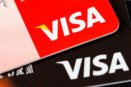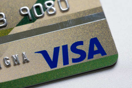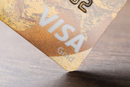 Moscow, Russia - 5 December 2020: VISA logo close-up on bank card, Illustrative Editorial.
