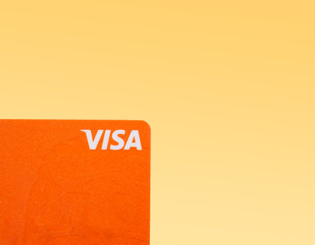 Bucharest, Romania - 03.25.2022: Orange Visa credit or debit card on gradient background. Online electronic commerce concept