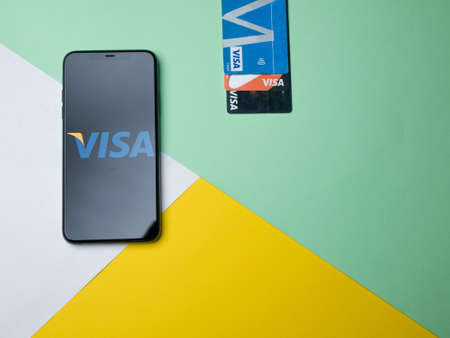 USA - May, 2020 VISA App on Iphone Screen on colored background. VISA is a multinational financial services corporation. VISA