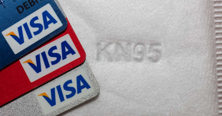 Miami, Florida - Jun 2, 2020: Part of KN95 standard facial mask and visa debit cards on top of it. Healthcare system concept. Close-up shot. Illustrative editorial.