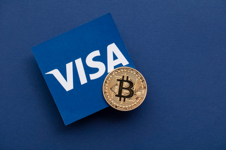 LONDON, UK - March 2021: Bitcoin cryptocurrency on Visa financial service logo