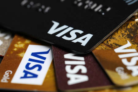 YEKATAERINBURG, RUSSIA - JAN 07, 2015: Pile of Visa credit cards. Visa is biggest credit card companie in the world.