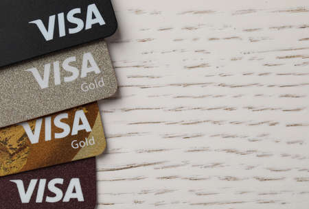 Moscow, Russia, August 2019: Credit cards: Visa, Visa gold, Visa electron, Mastercard, Mastercard gold. Cards with logos are laid out at the bottom of the frame. Copy space on the top.