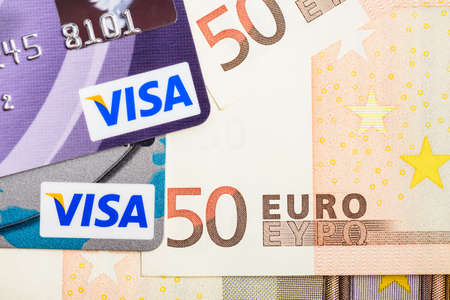 Moscow, Russia - August 05, 2017: Visa credit cards over Euro currency banknotes