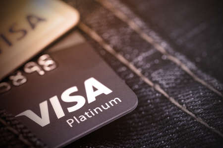 Moscow, Russia - August 05, 2017: Visa and Mastercard credit cards over blue jeans