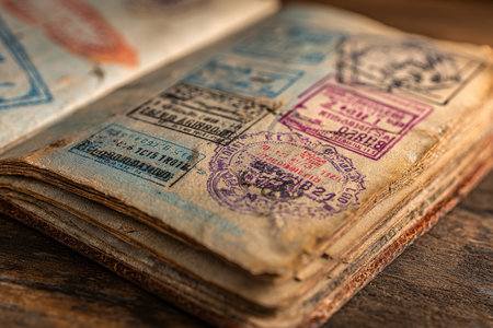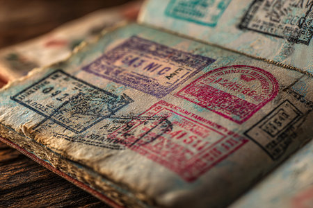 Open passport displaying colorful stamps from different countries, representing a journey full of cultural diversity and travel experiences.