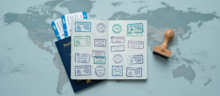 Passport opened to pages filled with entry and exit visa stamps, boarding passes and airplane stamp on a world map, evoking international travel, citizenship and global mobility