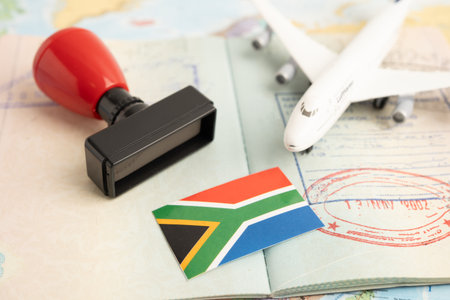 South Africa flag with passport and airplane for travel.