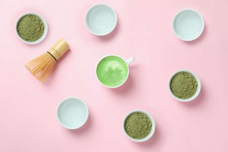 Matcha latte and accessories for making on pink background