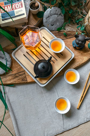 tea meditation, brewing Chinese tea on a tea tray. minimalism and the concept of abstract tea background