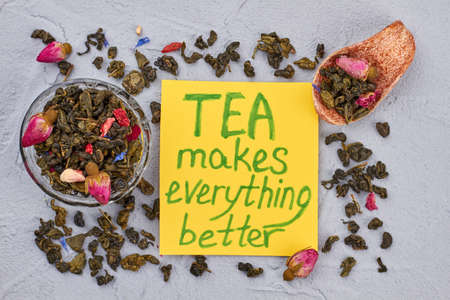 Composition with green tea on gray background. Green tea with red roses and yellow card with inscription TEA makes everything better.
