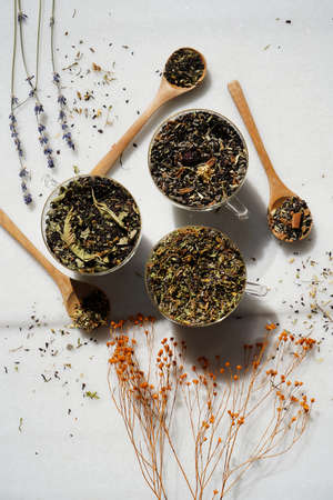 Dried tea cups with a tea spoon and green leaves. Variety of tea leaves