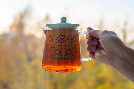 Hot drink black tea in glass teapot. Kettle for tea