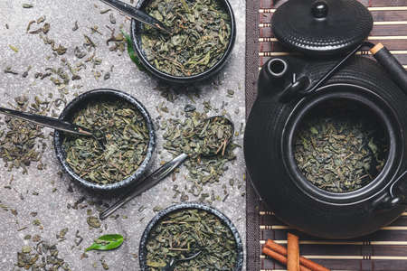 Bowls and teapot with dry green tea on dark background