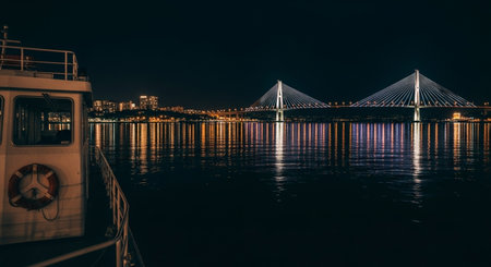 Winter aerial view of sunset over famous cable-stayed bridge from Vladivostok to Russky Island, Far East of Russia