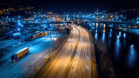 An aerial nighttime view shows a highway with trucks and city lights. The scene is illuminated by streetlights and the headlights of vehicles, with reflections in the adjacent water. This image could be used for transportation, infrastructure, or commercial applications. The colors are dominated by blues and oranges.