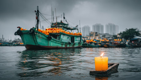 Burning candle in front of a fishing boat in the harbor, Thailand