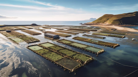 Generative AI : Aerial view of clam farms in Carril town and Vilagarcia de Arousa city in Ria de Arousa Pontevedra Galicia Spain