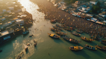 Generative AI : Aerial view of people celebrating the holy colour festival near the Shri And Baba Temple Uttar Pradesh India