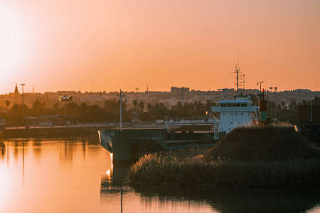 Port freighter and city skyline view